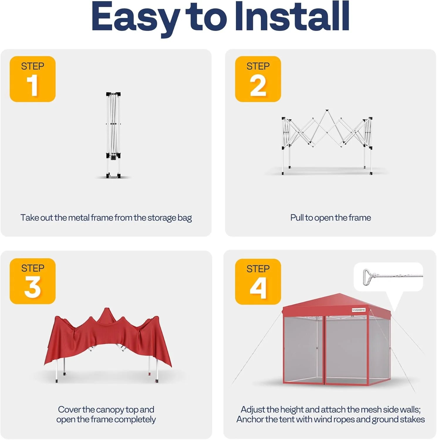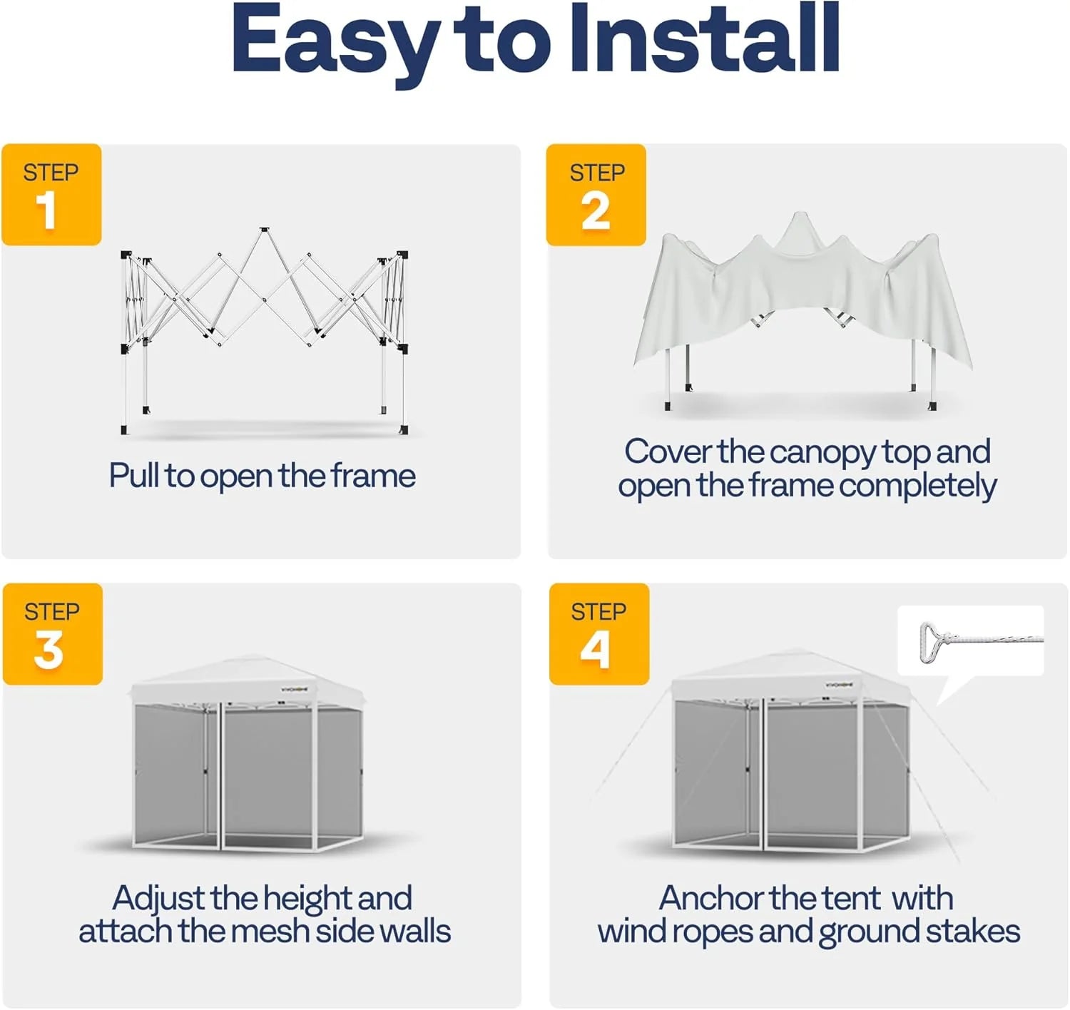 - SIMPLE INSTALLATION - The screened canopy comes with a pre-assembled pop-up frame, making it effortless for a single person to set it up without needing additional tools; Adhesive straps firmly secure the top cover to the frame, and thumb-friendly buttons simplify adjusting the canopy height; The metal feet plate, ground nails, and wind ropes are combined to keep it firmly anchored to the ground in windy conditions