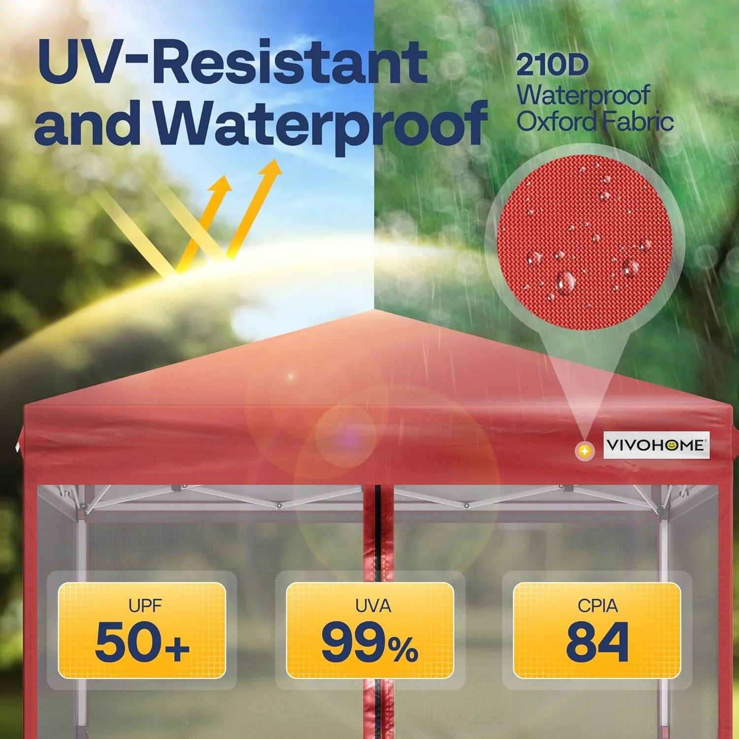 - PREMIUM MATERIAL - The screened gazebo tent is made from 210D silver-coated Oxford cloth with waterproof stickers, offering UPF 50+ protection and CPIA-84 flame retardant standards; It reflects 99% of harmful sunlight, ideal for outdoor use; The powder-coated steel frame resists scratches, rust, and corrosion; Note: it's recommended to retract the tent in strong winds and heavy rain for extended service life