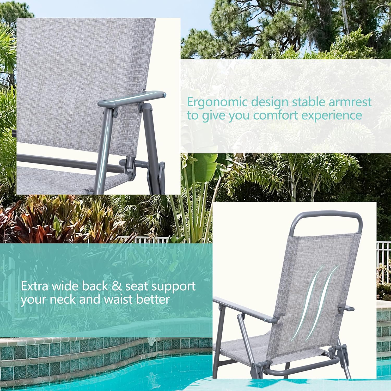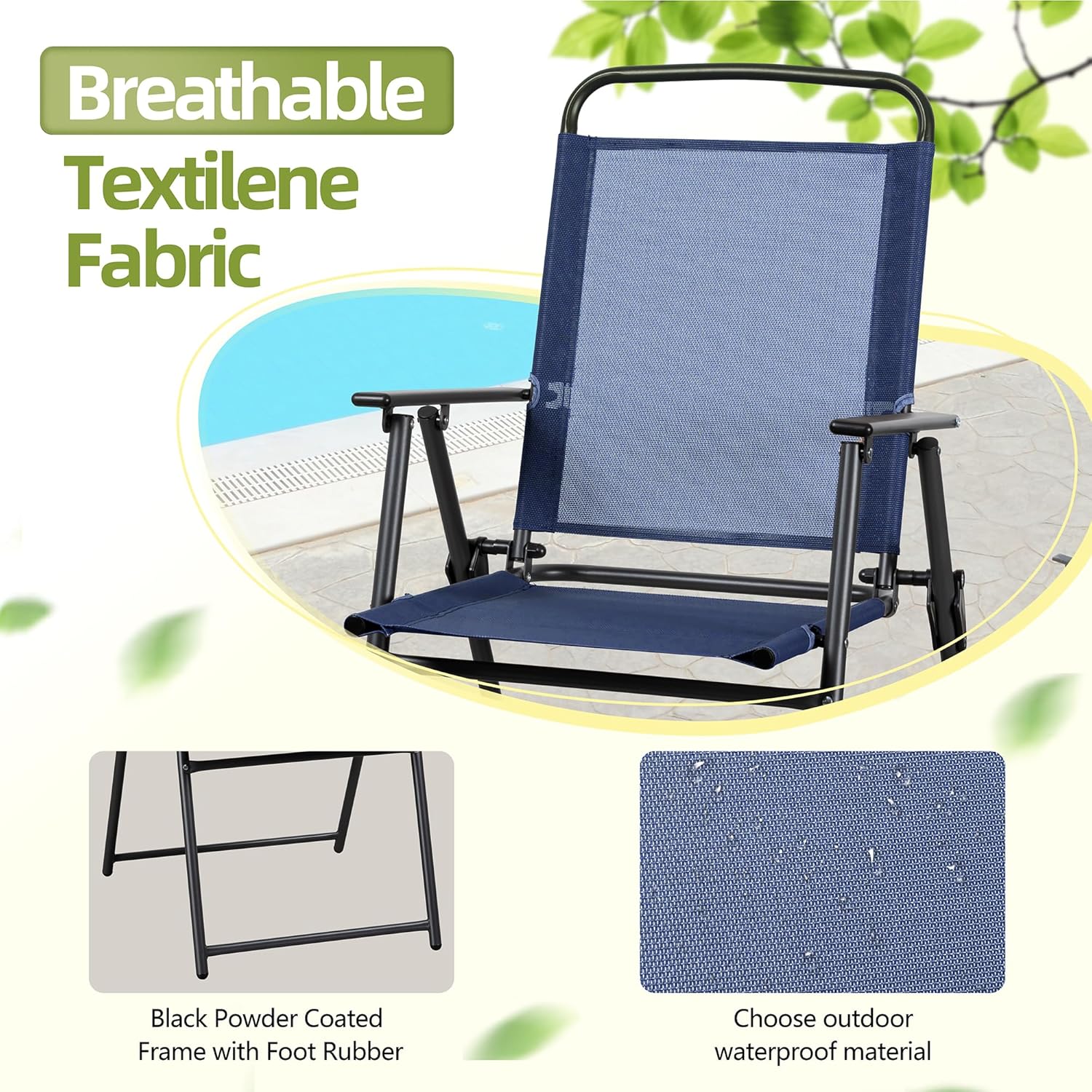- [Sturdy& Durable Material] Made of powder-coated steel, the chairs and table are weather and rust proof for long lasting use; Featuring a sling Textilene fabric, the 4 folding chairs are breathable, sweat absorption and flash drying