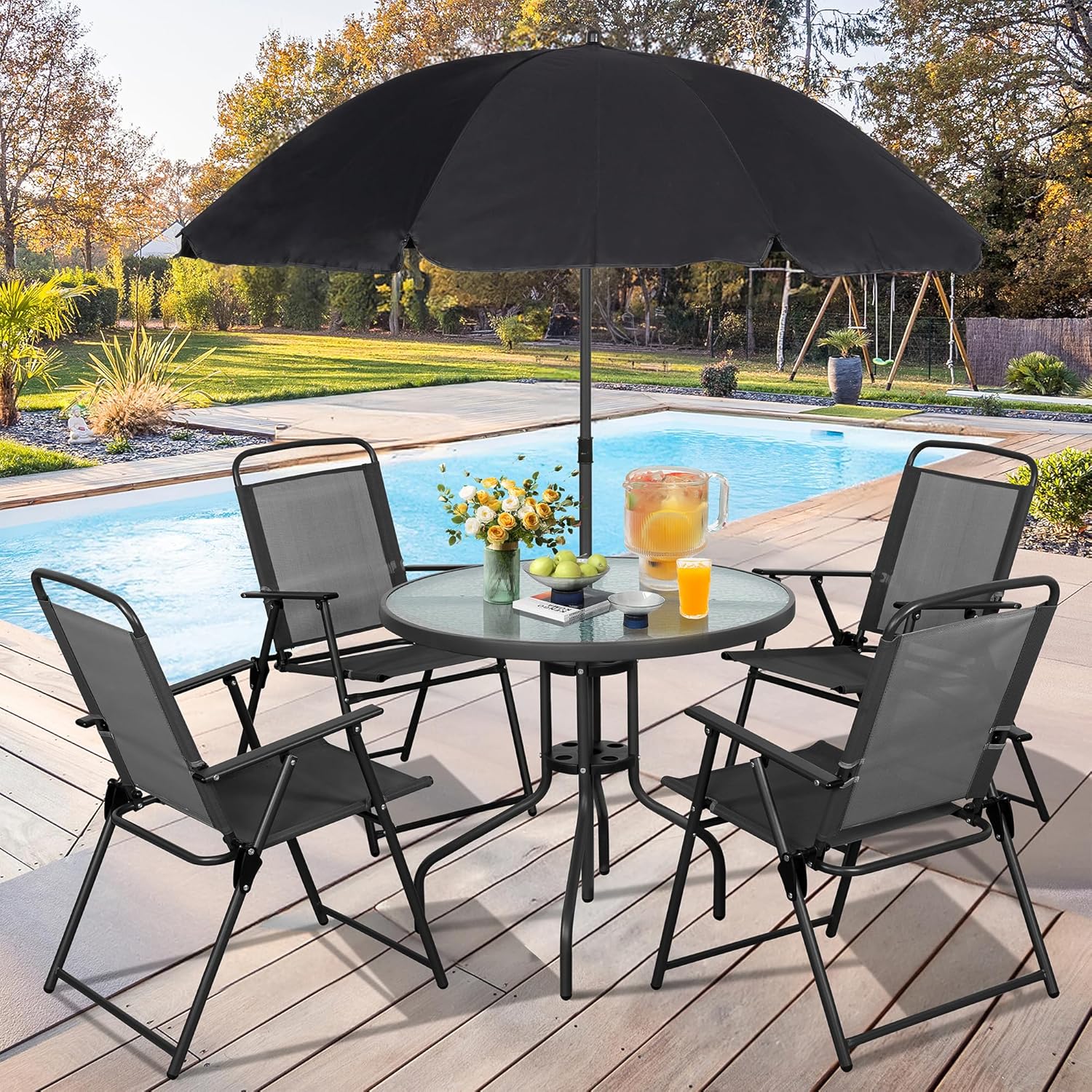 Vongrasig 6 Piece Folding Patio Dining Set,Small Metal Outdoor Garden Patio Table and Chair Set w/Umbrella for Lawn,Deck,Backyard,Black