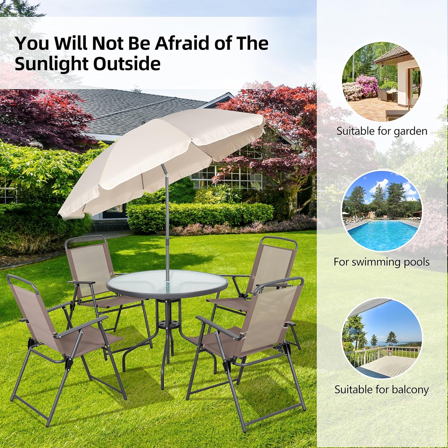 - [Elegant Patio Table with Umbrella] The elegant tempered glass table is crafted with 5mm thick glass top, floor glides and a pre-cut umbrella hole; A Bonus Umbrella is given to provide protection from the sun and can be easily removed when not needed.