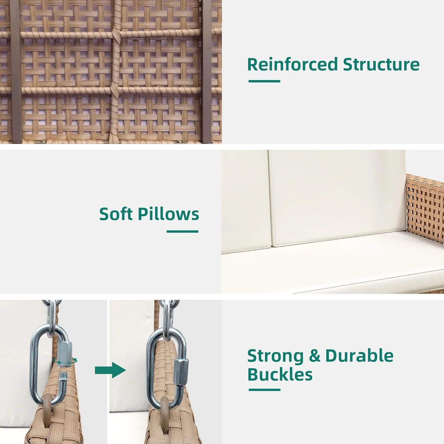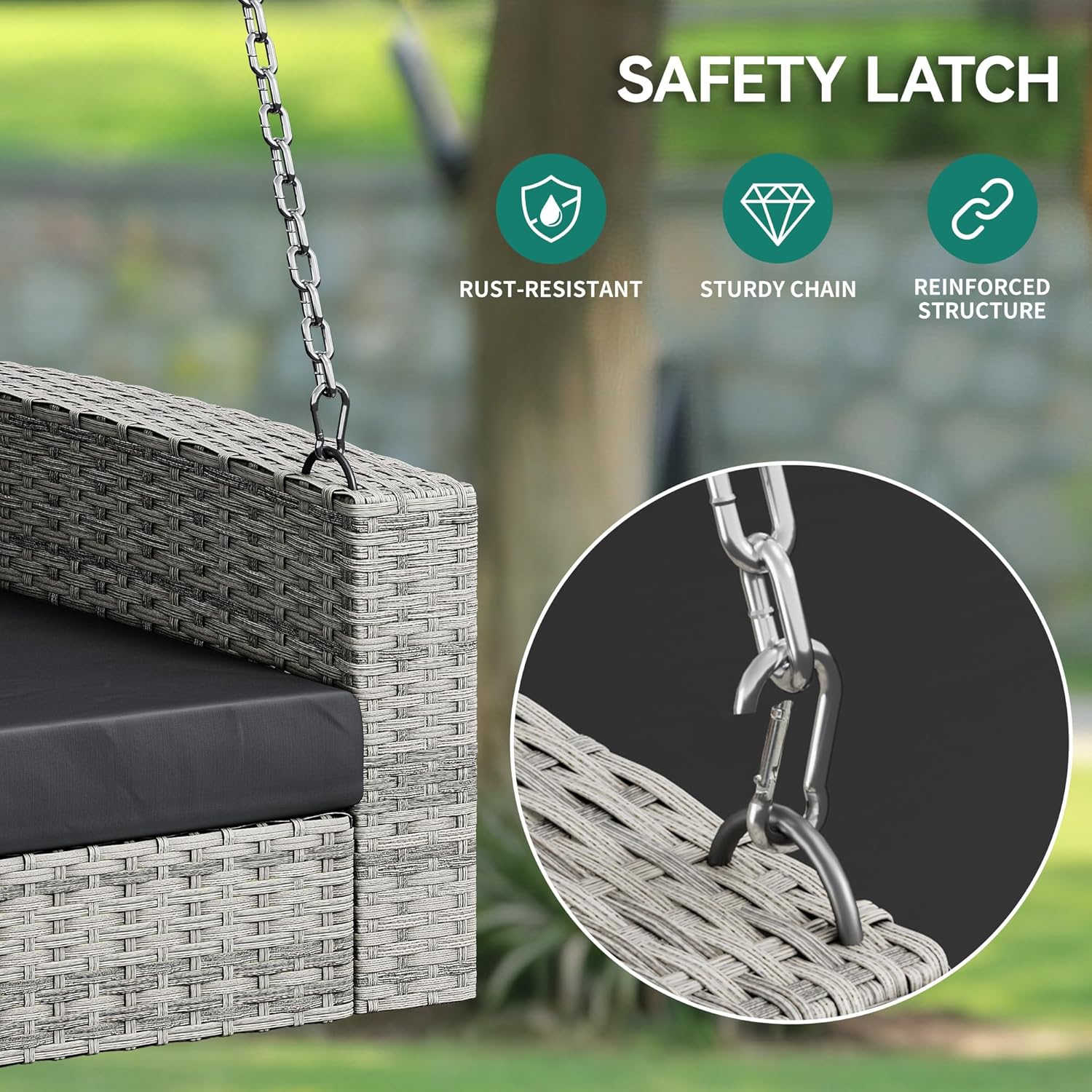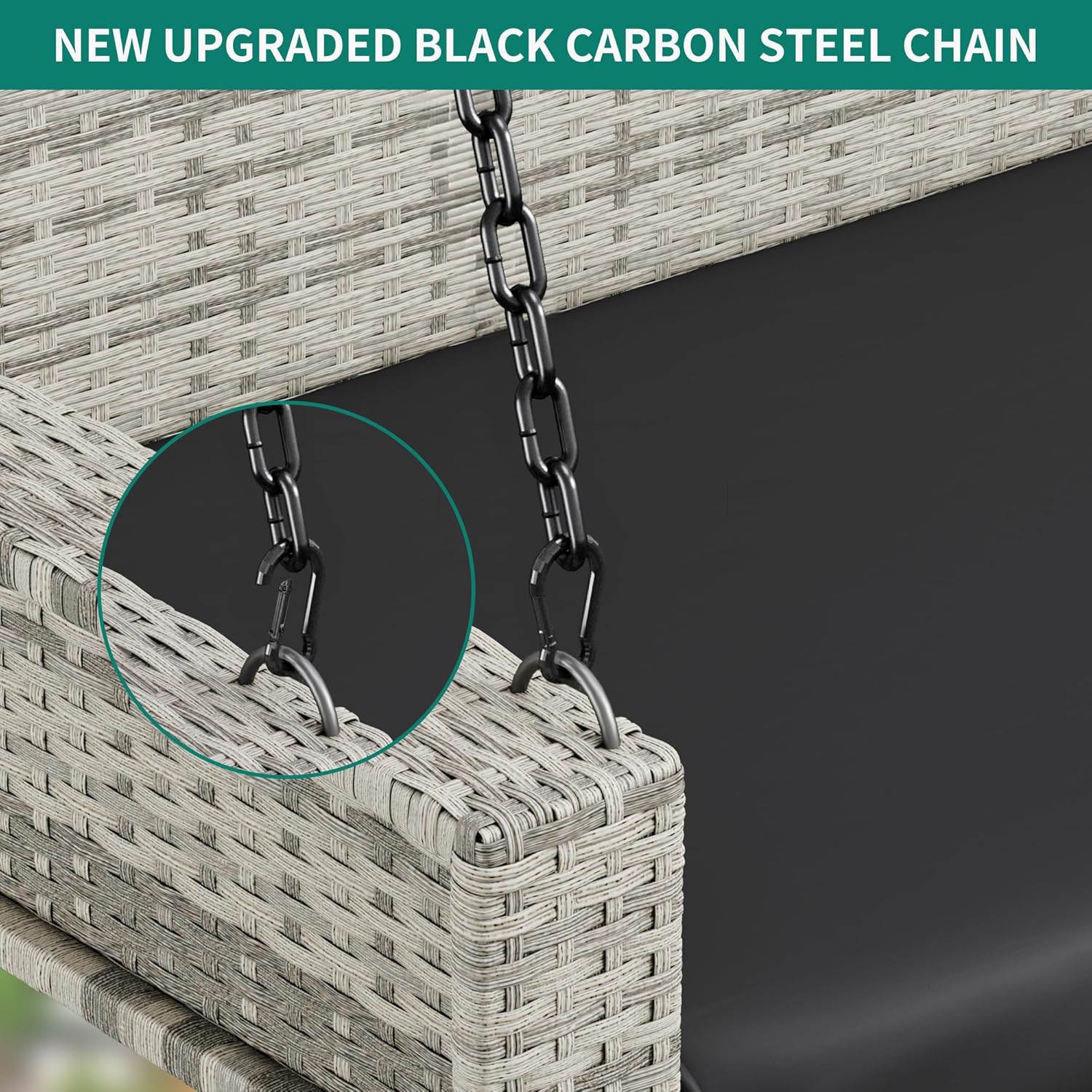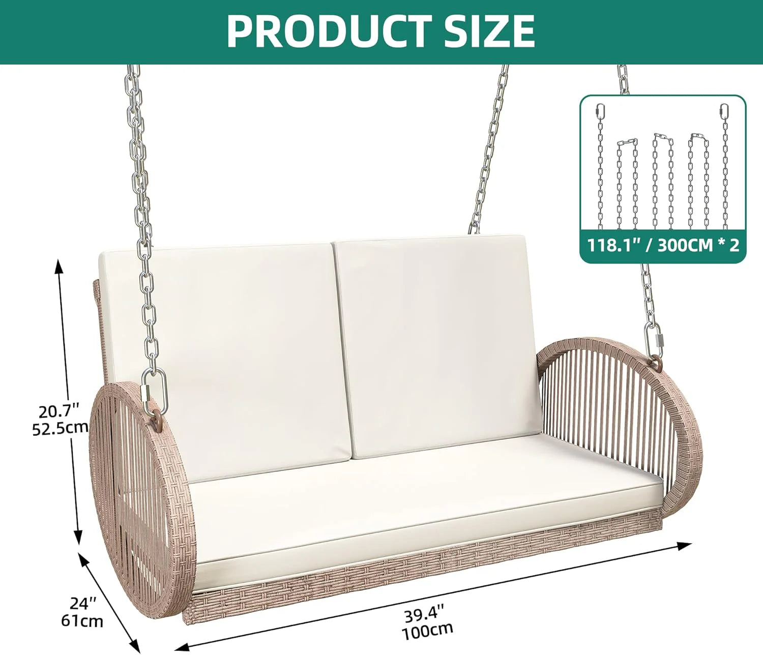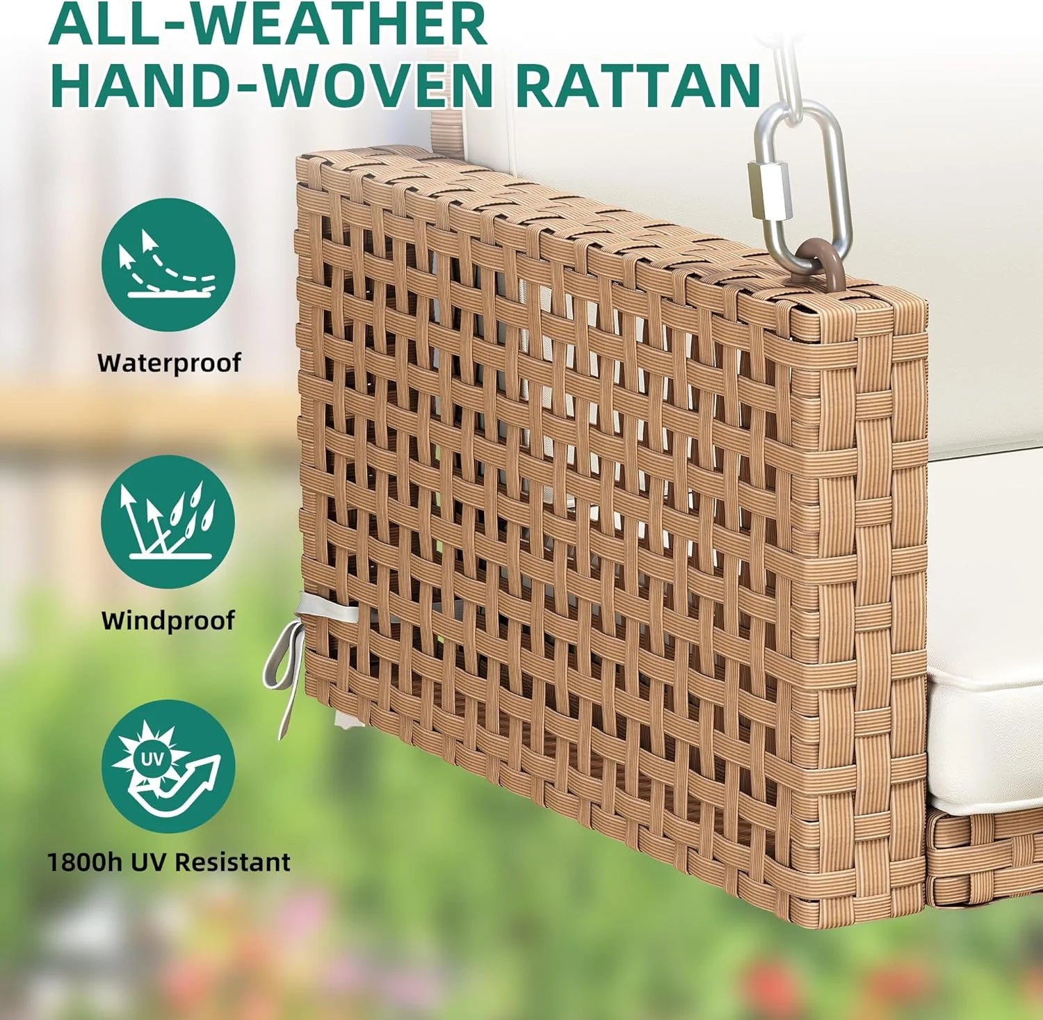- Weather-Resistant Durability: Crafted from top-tier polyethylene rattan, this swing bench resists fading, cracking, and all weather elements. It can withstand 1,000 hours of direct sunlight, keeping its vibrant appearance year after year, no matter the conditions